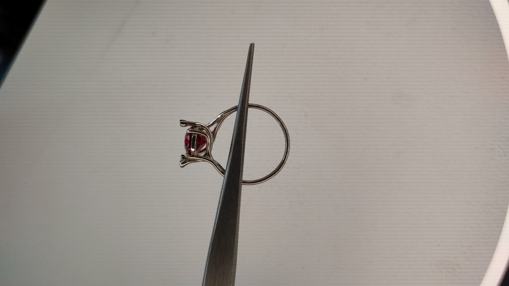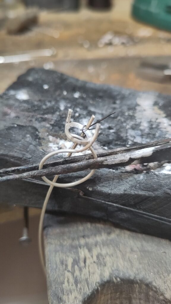 La sertissure principale est en fil carré mis en forme à la pince. Pour les oxydes de zirconium de 1.5mm j’ai utilisé du fil de 2mm brasé à l’extrémité des fils constituant la bague.