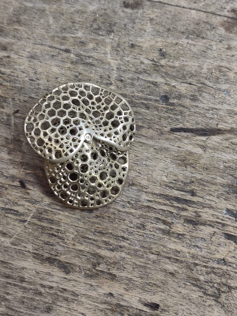 Avant cela, il fallait réussir à donner un aspect végétal au métal. Nous sommes partis de plaques de métal (appelés planés) que nous avons mis en forme à l’aide de bouterolles et de dés à emboutir. La bouterolle a une boule à son extrémité qui permet d’enfoncer le métal lorsque l’on tape dessus. Divers dés à emboutir permettent d’avoir des contreformes que l’on va venir épouser progressivement en déformant le métal. Il a fallu plusieurs essais pour avoir des résultats satisfaisants. L’objectif étant d’être le plus ressemblant possible à la réalité, mais aussi que ça puisse être sertissable, les pétales ne sont donc pas trop refermées sur elles même.
