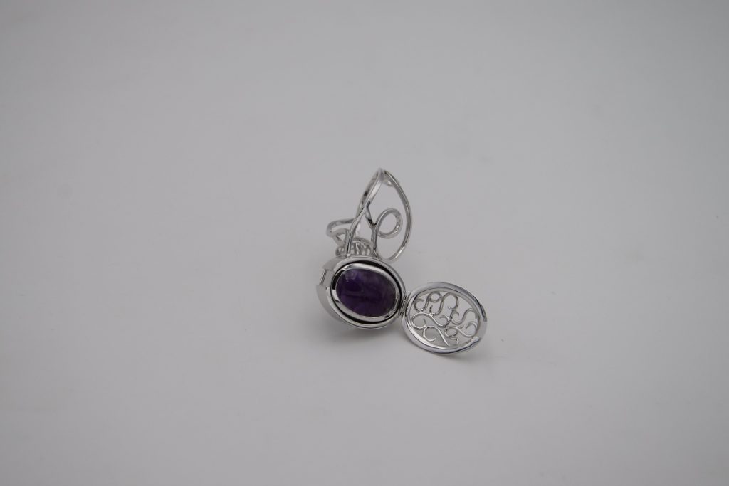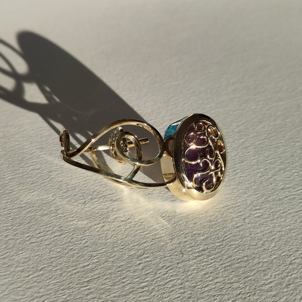 Les inspirations pour la bague sont le casque d’escrime, dont la forme nous rappelait celle d’un serti clos d’un cabochon. Nous avons voulu aussi représenter son mouvement d’ouverture avec une charnière, ce qui nous permettait de changer les pierres présentées et donc de représenter les différents « visages » qui peuvent être derrière le masque.